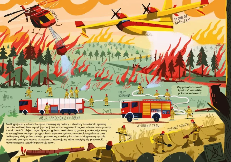 Książka „Co robią strażacy i strażaczki” jest doskonałym wprowadzeniem dla najmłodszych do fascynującego świata straży pożarnej. Dzięki przystępnemu językowi oraz atrakcyjnej szacie graficznej, dzieci mają okazję poznać codzienne zadania i wyzwania, z jakimi zmagają się strażacy. Publikacja wyjaśnia kluczowe aspekty ich pracy, takie jak gaszenie pożarów, udzielanie pierwszej pomocy, a także znaczenie prewencji pożarowej.