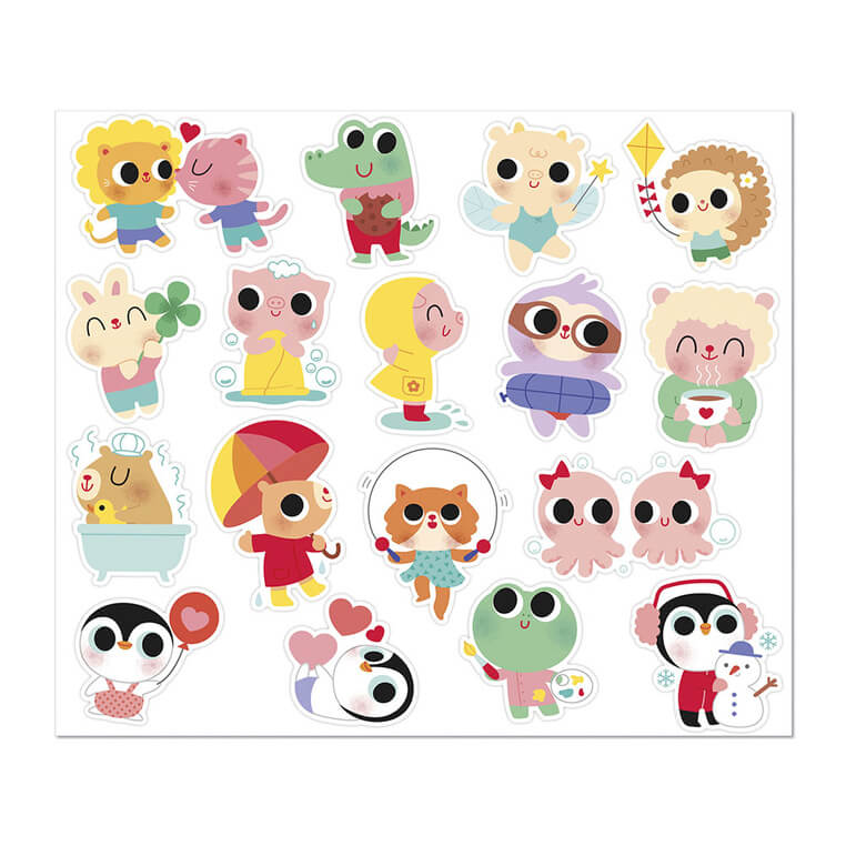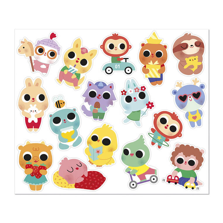 Zestaw naklejek Małe zwierzęta francuskiej marki JANOD zawiera 100 szt. dużych naklejek, rozmieszczonych na 6 arkuszach (17 x 20 cm każdy). Naklejki są odpowiednie dla dzieci już o 18 miesiąca życia – mają optymalny dla małych rączek rozmiar. Naklejki przedstawiają urocze scenki z życia młodych zwierzaczków, np. kapibarę w kąpieli, kurczaczka na hulajnodze czy jeżyka puszczającego latawiec. Połowa z nich posiada połyskującą, metaliczną powierzchnię, co dodaje im wyjątkowego uroku.