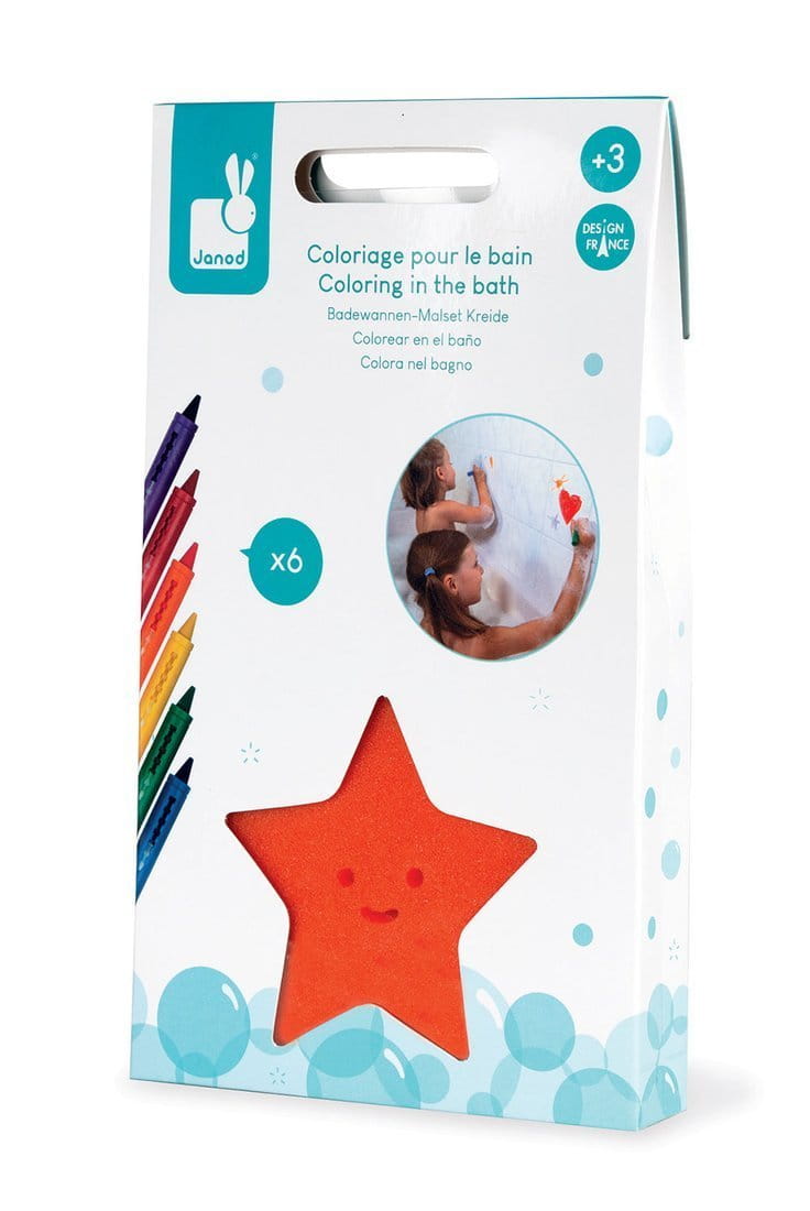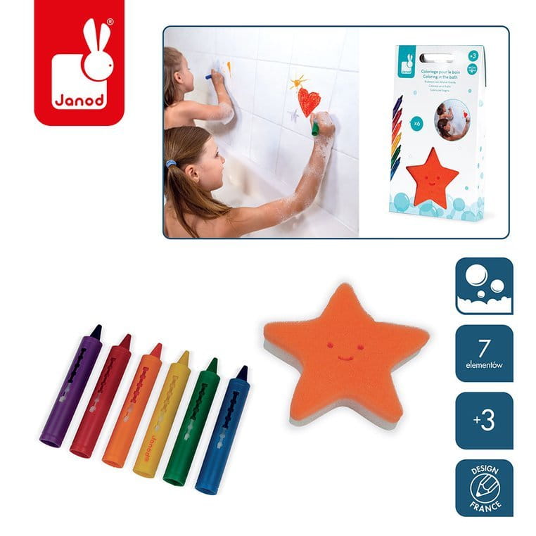 Kredki do kąpieli francuskiej marki JANOD to 6 kolorowych sztyftów (żółty, pomarańczowy, czerwony, fioletowy, niebieski i zielony) w osłonkach z tworzywa. Nadają się do malowania po śliskich powierzchniach, np. wannie czy kafelkach. Łatwo się zmywają. Do zestawu dołączona jest urocza gąbka w kształcie uśmiechniętej rozgwiazdy. Rysowanie to doskonały sposób na wyciszenie i idealny umilacz czasu, spędzanego w wannie. Zabawkę zaprojektowano we Francji. Zapakowane jest w estetyczne pudełko z uchwytem. Idealnie nadaje się na prezent.