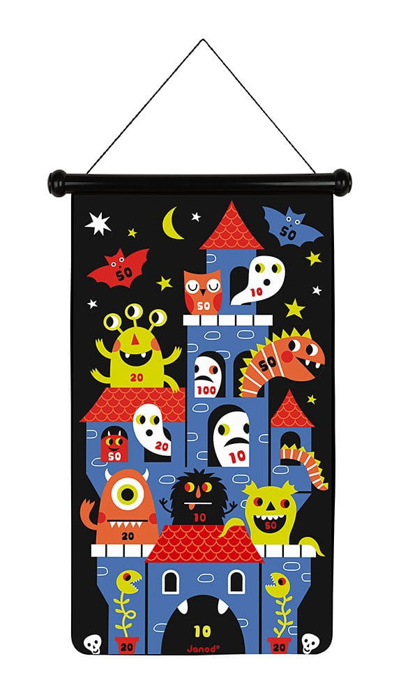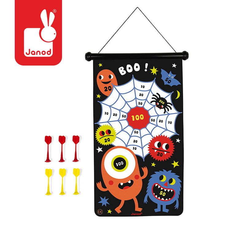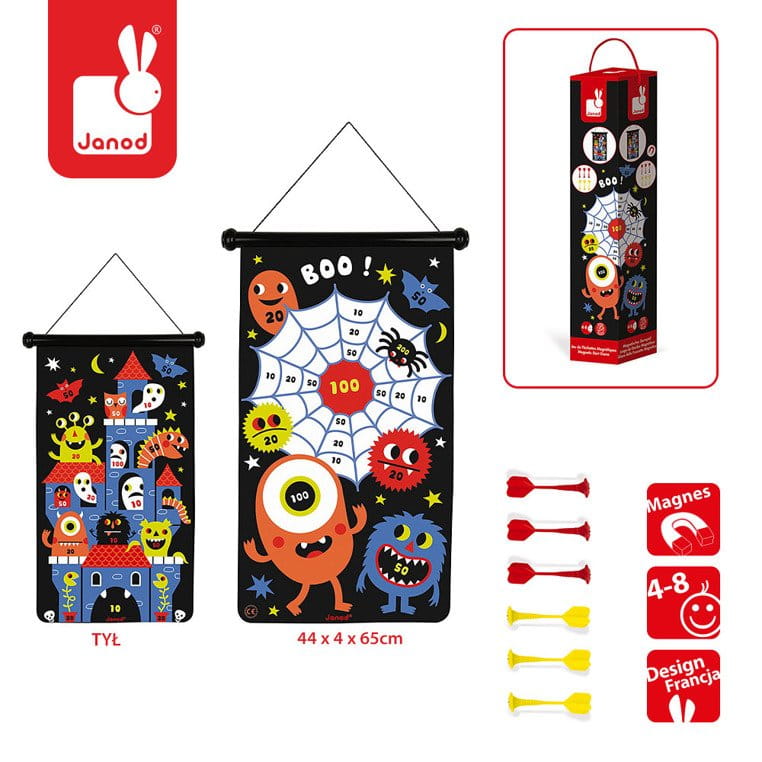 Magnetyczna gra w rzutki Potwory francuskiej marki JANOD to wspaniała zabawa dla dwojga – zarówno dzieci, jak i ich rodziców. Zestaw składa się ze zwijanej na rolkę tarczy ze sznurkiem do jej zawieszenia np. na ścianie oraz z 6 magnetycznych rzutek w dwóch kolorach (3 czerwone i 3 żółte). Czarna tkanina tarczy ilustrowana jest dwustronnie postaciami kolorowych potworów, pajęczyny i nawiedzonego zamku. Rzutkami należy celować w tarczę z odpowiedniej, ustalonej przez graczy odległości, w taki sposób, by trafić w oznaczone na niej punktowane miejsca. Celem gry jest zgromadzenie w trzech rzutach jak największej ilości punktów. Gracz, któremu się to uda, wygrywa. Gra ta ćwiczy koncentrację i zręczność.
