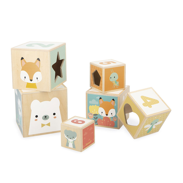 Układanka drewniana piramida-wieża z serii Pure francuskiej marki JANOD to kreatywna zabawka dla dzieci od 1. roku życia. Składa się z 6 klocków – sześcianów różnej wielkości, dzięki czemu można je układać jeden na drugim lub chować jeden wewnątrz drugiego. Klocki są poręczne i ciekawie ilustrowane postaciami zwierząt czy kolejnymi cyferkami. Mają także otwory w różnych geometrycznych kształtach. Układanka pomaga zrozumieć pojęcie rozmiarów i sekwencji, liczyć, rozróżniać kolory i figury, ćwiczyć chwyt i koncentrację. Zabawka zaprojektowana została we Francji. Jest zapakowana w estetyczne kartonowe pudełko. Idealnie nadaje się na prezent.