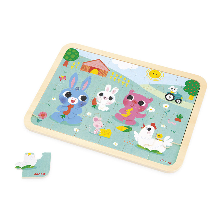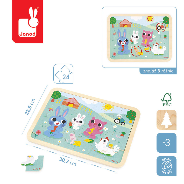 Drewniane puzzle Farma francuskiej marki JANOD to wspaniała układanka dla dziecka od 3. roku życia. Zestaw składa się z 24 drewnianych puzzli i podstawki z ramką, ułatwiającej ich układanie. Na ułożonym obrazku i na planszy pod spodem znajduje się ilustracja, przedstawiająca farmę – różnią się one od siebie 5 szczegółami, które należy odnaleźć.