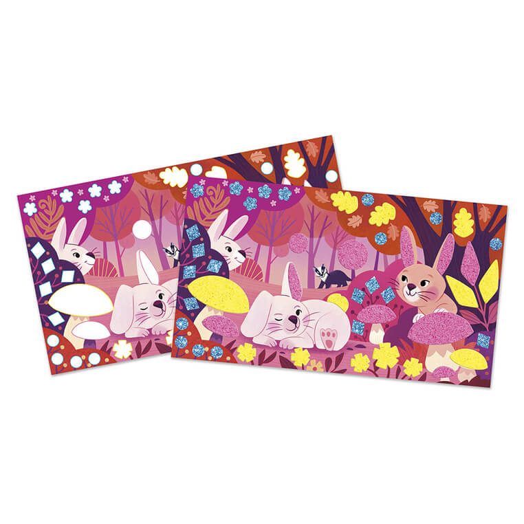 Zestaw kreatywny z piankowymi naklejkami i piaskiem Leśni przyjaciele francuskiej marki JANOD. Zawiera 3 plansze-obrazki (20,7 x 11,8 cm), przedstawiające spotkania leśnych zwierzątek. Ilustracje należy w odpowiednich miejscach ozdobić fluorescencyjnym piaskiem (różowym lub żółtym) oraz piankowymi naklejkami (w zestawie). Ozdabianie piaskiem i naklejanie to dla dziecka długie godziny angażującej i jednocześnie uspokajającej, wyciszającej zabawy, a gotowe obrazki staną się wspaniałym elementem dekoracyjnym dziecięcego pokoju.