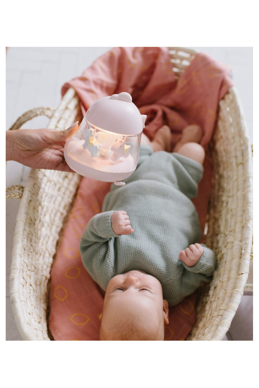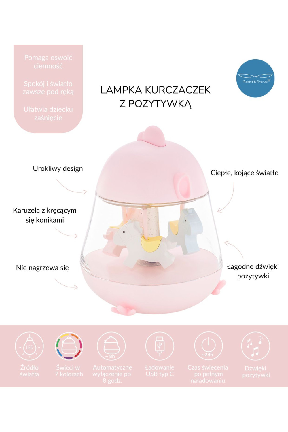 Lampka nocna Kurczaczek z karuzelą i pozytywką zapewnia kojące towarzystwo w dzień, jak i w nocy. Kręcące się koniki i delikatna melodia pozytywki uspokoją maluszka i wprowadzą w odprężający nastrój.
