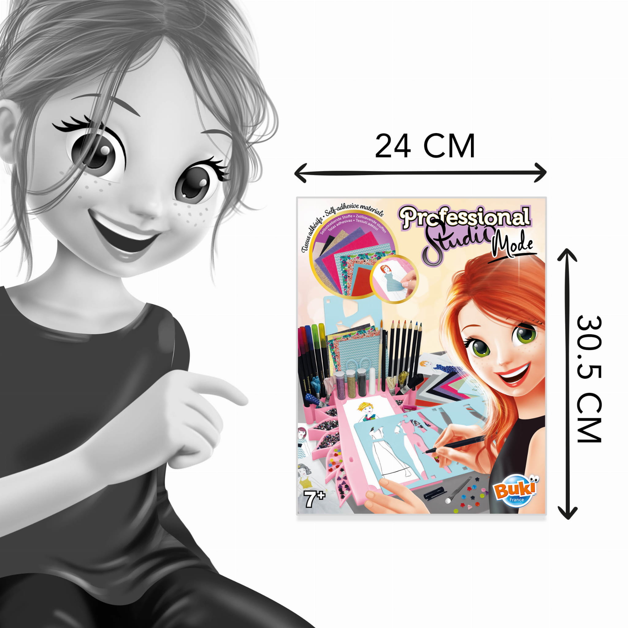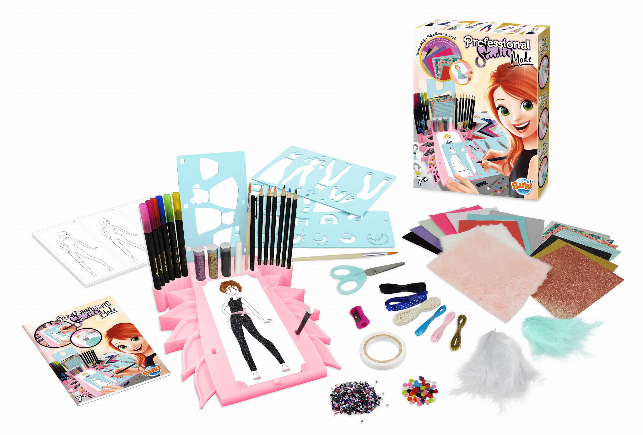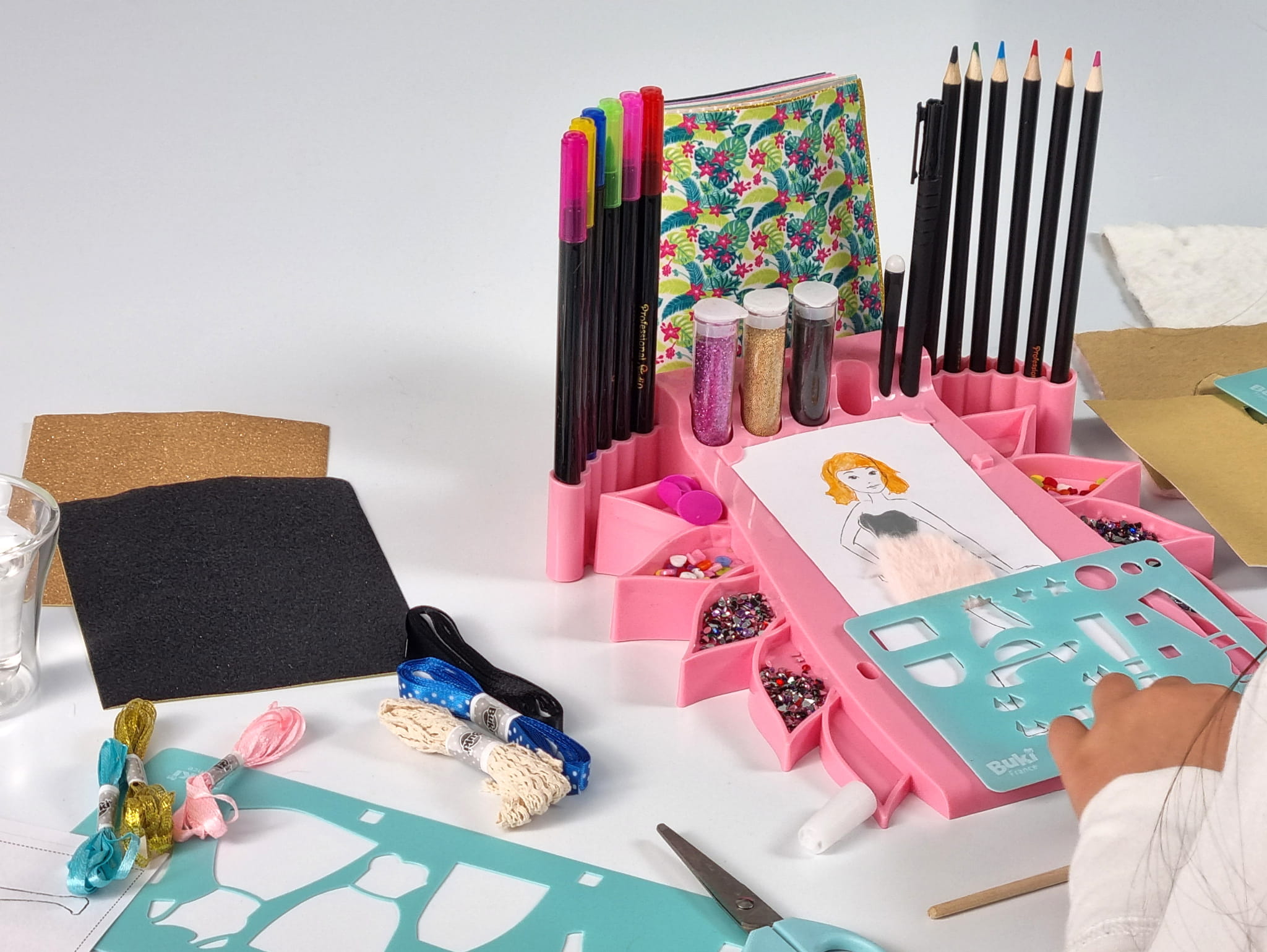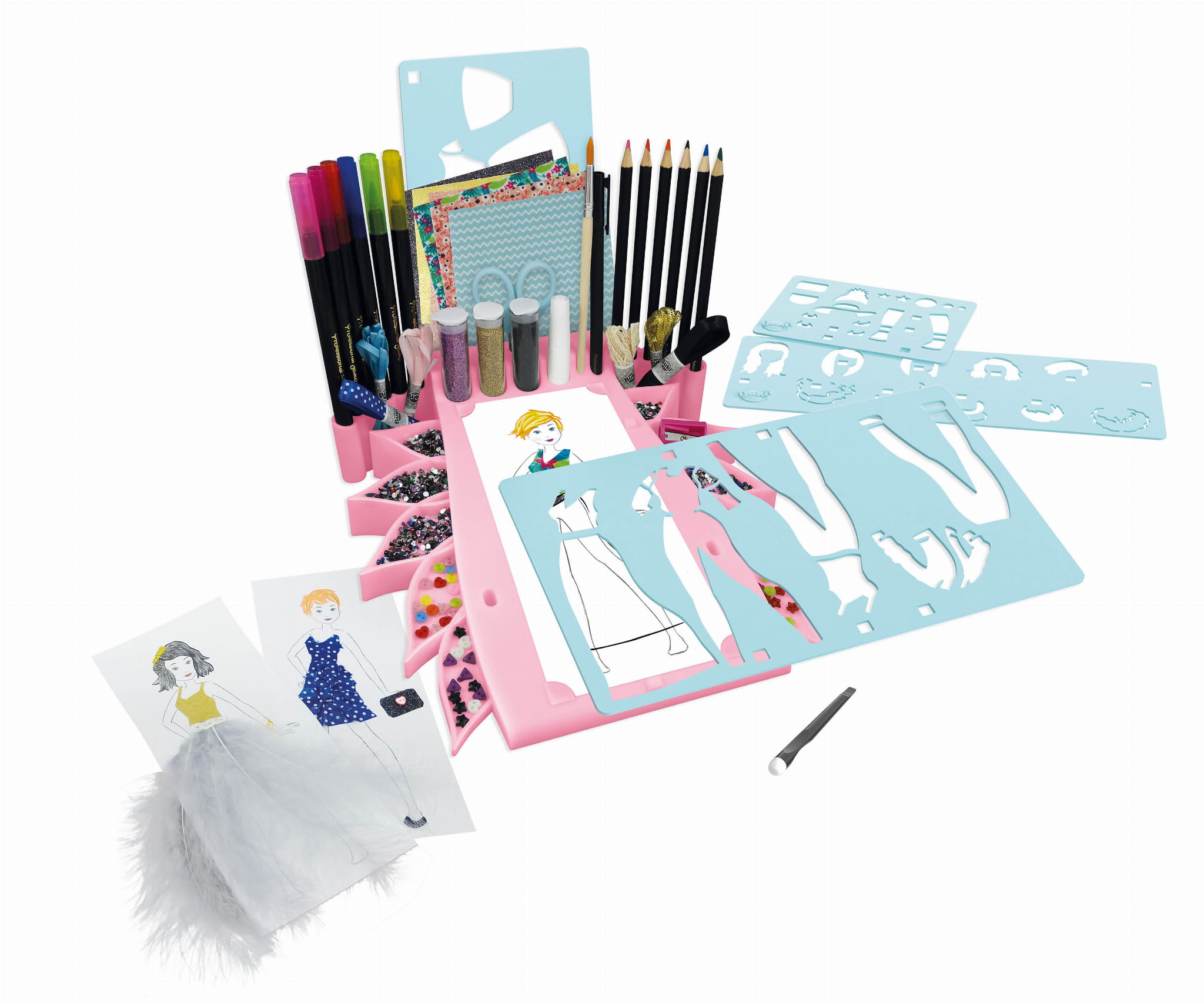 Stwórz własną mini pracownię mody! Ułóż arkusz z sylwetką na podkładce, dobierz fryzurę z szablonów, narysuj strój i… dodaj mu kształt oraz objętość dzięki tkaninom, piórom, cekinom i wstążkom. Kolorowe, samoprzylepne materiały oraz akwarelowe kredki sprawią, że projekty wyglądają jak z prawdziwego domu mody. Dwie szufladki w przyborniku pomagają trzymać drobiazgi w ryzach.