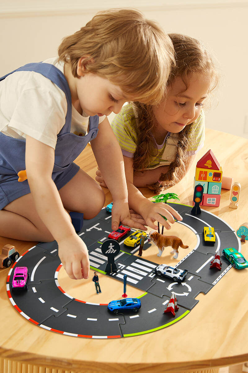 Tor wyścigowy na podłodze własnego pokoju! Ten zestaw dla najmłodszych zawiera różne rodzaje dróg i znaków drogowych, które pozwolą na samodzielne ułożenie trasy, po której mogą poruszać się wszystkie pojazdy, jakie tylko wpadną dziecku do głowy. Wspólne planowanie trasy z naszą pociechą to świetna okazja, by wytłumaczyć jej, jak działa ruch uliczny. Ale jeśli wolicie tworzyć kompletnie szalone trasy, droga wolna!