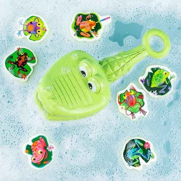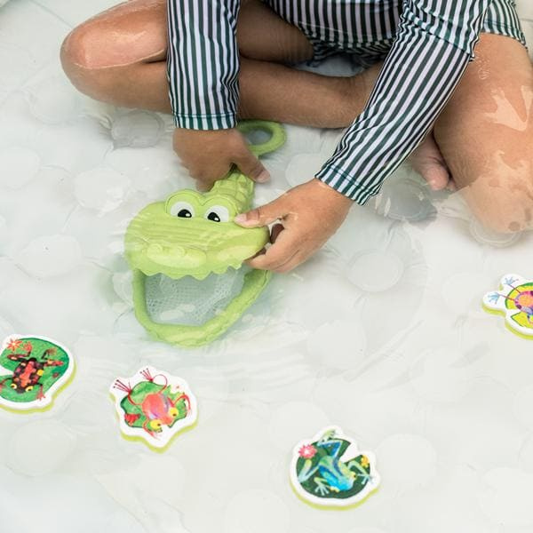 Zabawki kąpielowe – Złap Żabkę od Tiger Tribe to wspaniała zabawa podczas kąpieli. Siatka w kształcie krokodyla służy do łowienia piankowych żabek unoszących się na powierzchni wody. Gwarantuje świetną zabawę w przeszukiwanie wanny w poszukiwaniu jaskrawo kolorowych, ilustrowanych piankowych żabek. Zabawka pomaga rozwijać umiejętności motoryczne, siłę chwytu i koordynację ręka-oko, gdy maluchy ćwiczą chwyt na przyjaznej dla dzieci rączce. Produkt wykonany z bioplastiku, jest częścią serii ECO.