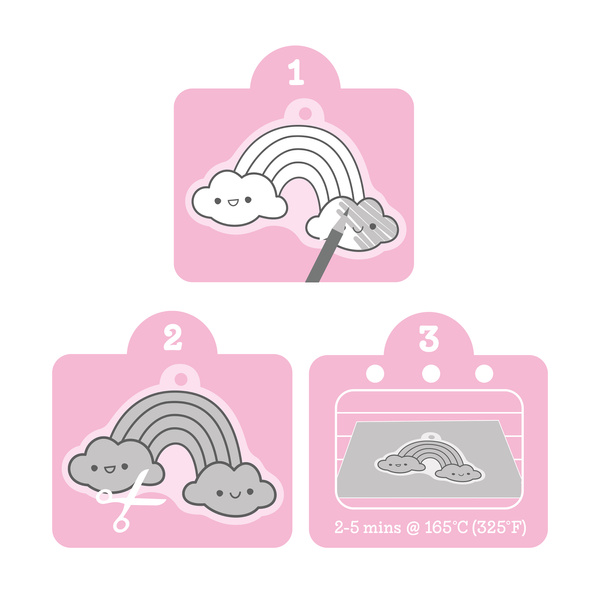 UWAGA! Konieczny jest nadzór osoby dorosłej. Wymagany jest konwencjonalny piekarnik. Nie używaj kuchenki mikrofalowej. Proces kurczenia się materiału nie jest częścią funkcji zabawki i powinien być przeprowadzany przez osobę dorosłą. Nie przekraczaj temperatury 165°C. Nie przekraczaj maksymalnego zalecanego czasu obróbki cieplnej. Nie podgrzewaj materiału jednocześnie z żywnością w domowym piekarniku.