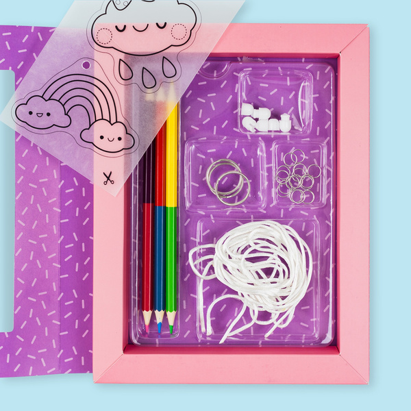 Skład zestawu: 8x arkuszy Magicznego Plastiku zawierających 16 ilustracji, 3x dwustronne kolorowe kredki, 5x metalowych breloków, 3x sznurki i łączniki do zawieszek, 4x sznurki do bransoletek, 16x metalowych łączników, łatwa do wykonania instrukcja